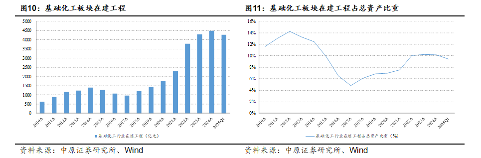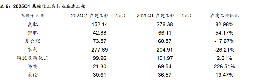 从子行业来看,2025年一季度基础化工各子行业中,15个子行业在建工程同比增长,涤纶、氮肥、锦纶、无机盐、钾肥等行业在建工程同比增幅较大。从绝对规模上看,聚氨酯、锂电化学品、有机硅、其他化学制品、氯碱等行业在建工程规模较大。