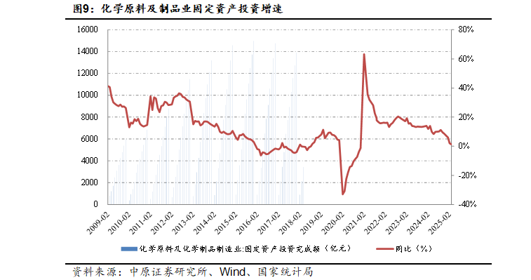 2020年下半年以来,化工行业固定资产投资增速开始进入新一轮增长阶段。2021年、2022行业固定资产投资总额同比分别增长15.7%和18.8%,增速创2013年以来的新高。随着行业景气的不断下滑,2023、2024年行业固定资产投资分别增长13.40%、8.6%,增速较前期有所回落,但总体仍保持在较高水平。2025年1-4月,行业固定资产投资增速进一步回落至1.3%。随着化工行业固定资产投资力度的下降,未来行业产能过剩的压力有望出现逐步缓解。