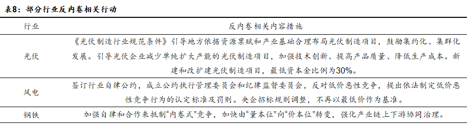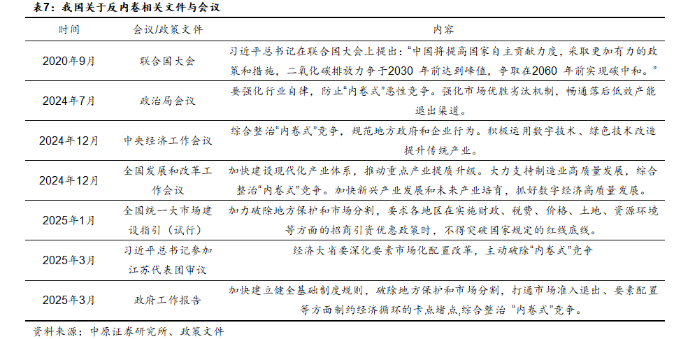 近年来我国部分工业领域因供需失衡陷入低水平重复的 “内卷式”竞争,表现为盲目扩产、价格混战和资源错配等形式,对我国经济的高质量发展带来阻碍。随着我国经济进入新旧动能转换期,传统依赖要素投入的粗放模式难以为继。2024年以来,中央政治局会议、中央经济工作会议连续强调需“综合整治内卷式竞争”,2025年政府工作报告首次将“综合整治内卷式竞争”写入工作目标,指出通过破除地方保护和市场分割、打通市场准入退出、要素配置等方面制约经济循环的卡点堵点,综合整治“内卷式”竞争。