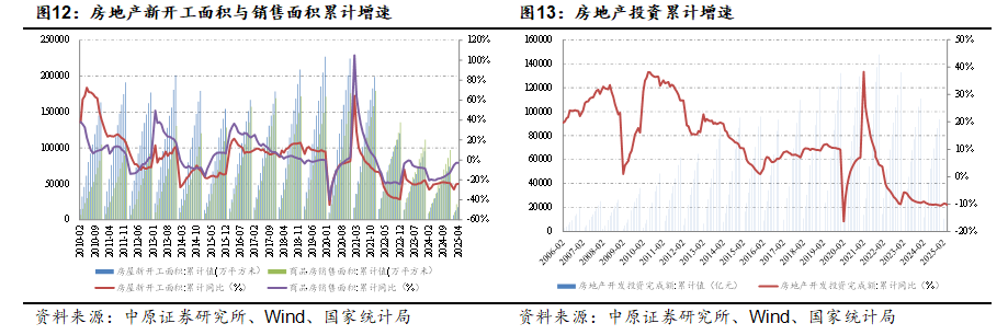 从房地产领域的需求来,2021年以来,受房地产调控政策收紧的影响,房地产的各项数据出现快速下滑,对化工需求亦造成拖累。目前房地产行业需求仍处于较低态势,行业下滑的态势依然延续。从开工、销售和房地产投资的数据来看,2023、2024年年全国房地产开工和销售面积分别同比下滑20.40%、23.00%和8.50%、12.90%。2025年1-4月,全国房地产开工和销售面积分别为1.78和2.83亿平方米,同比下滑23.80%和2.80%,仍然维持下滑态势,其中销售面积下滑幅度明显减慢。房地产固定资产投资方面,2023、2024年全国房地产固定资产投资11.09和10.03万亿元,同比下滑9.60%和10.60%,2025年1-4月,房地产固定资产投资2.78万亿,同比下滑10.30%。总体来看,房地产行业仍处于下行的阶段,下滑幅度有所放缓。