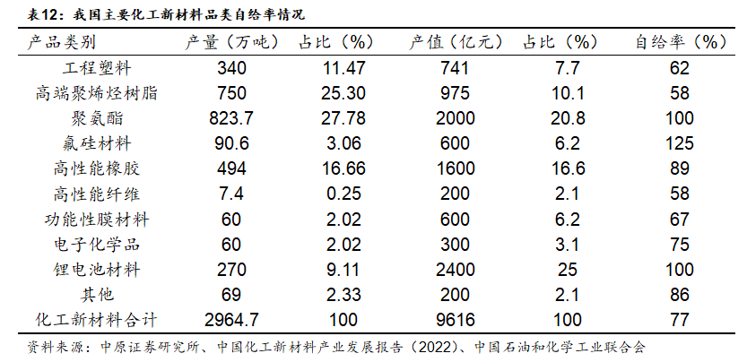 在行业快速发展的同时,我国新材料行业的高端产品仍然存在明显的差距和短板。根据《中国化工新材料产业发展报告(2022)》,2021年世界化工新材料总产值为4000亿美元(折合人民币约 2.8 万亿元),其中高端产能主要集中在北美、欧洲、日本等发达地区;同期我国化工新材料行业产值为9616亿元,约占世界总产值的34%。化工新材料产值仅占化学工业的11.1%,与发达国家存在较大差距。从具体品种来看,高端聚烯烃树脂、高性能点位、工程塑料、功能性膜材料和电子化学品等品种自给率相对较低,仍有较大的国产替代空间。