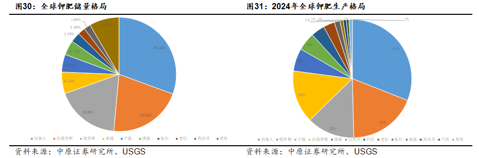 钾肥的生产主要来自于钾矿和盐湖卤水,具有较强的资源属性。全球钾肥资源分布不均,储量集中于加拿大、俄罗斯、白俄罗斯等国家,三国合计储量占全球的60%以上。由于资源分布的不平均,全球钾肥供给亦呈现高度集中的格局,主要集中在加拿大、俄罗斯、中国、白俄罗斯等国,Nutrien、美盛、乌钾、白钾等钾肥巨头主导了全球钾肥的生产。2024年,我国钾肥产量约占全球产量的13.13%,占比较2023年下降0.74个百分点。