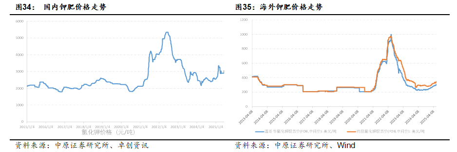 钾肥由于其资源稀缺性,因此需求量和农作物的价格、盈利能力具有较大的正相关性。在农作物的价格高,盈利能力好的时候,钾肥的使用占比会提升,带来需求的增长。从钾肥价格与国际粮食价格来看,粮食价格的上涨有助于农药销售额的增长。2024年初以来,国际农产品价格开始底部上行,有望推动钾肥等化肥价格迎来上涨。截至6月13日,国内氯化钾市场价为3055元/吨,2025年以来涨幅19.18%,较2024年3月低点上涨41.11%。国际价格方面,约旦和温哥华FOB价格分别为345.5和305.5美元/吨,2025年以来分别上涨21.44%和23.19%。未来全球钾肥产能增速保持在较低水平,供应增量有限,随着需求的稳步增长,有望推动钾肥价格与行业景气度的进一步提升。