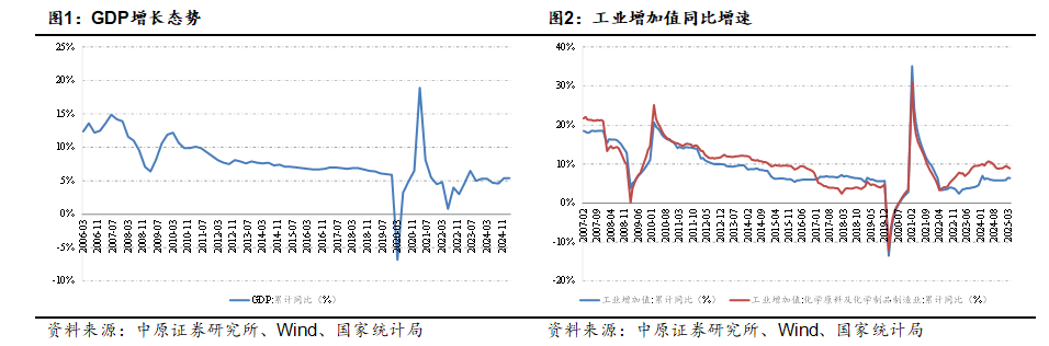 2024年以来,随着中央政治局一揽子增量政策的推出显效,我国宏观经济总体维持向好回升态势。根据国家统计局数据,2025年一季度我国GDP同比增长5.4%,增速同比提升0.1个百分点,环比持平。从工业增加值来看,1-4月份全国规模以上工业增加值同比增长6.4%,增速同比提升0.1个百分点,环比下降0.1个百分点。化学原料及化学制品制造业工业增加值累计同比增长8.9%,同比下降1.4个百分点,环比下降0.3个百分点。