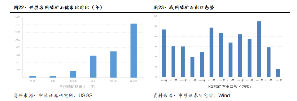 由于磷矿石资源具有不可再生和不可循环利用的特点,同时磷元素作为组成生命的基本元素,其应用具有不可替代性,因而磷资源具有重要的战略意义,对磷矿石资源的保护也是必然的趋势。各国纷纷出台政策限制磷矿开采。如美国作为全球第三大磷矿产地,早在20世纪80年代就开始减少磷矿开采与出口,自1996年开始逐步禁止磷矿出口,并于2004年开始不再出口。尽管我国磷矿石储量位居世界第二,但由于长期的大规模开采,我国磷矿石的资源保障程度并不高。按现有产量计算,我国的磷矿石资源可供开采年限仅约42年,因而对磷矿石资源保护力度的提升是必然的趋势。近年来,我国出台了一系列政策,逐步限制磷矿石的出口,规范磷矿石的开采。我国磷矿出口量也由2008年的179.6万吨降低至2023年的28.1万吨。
