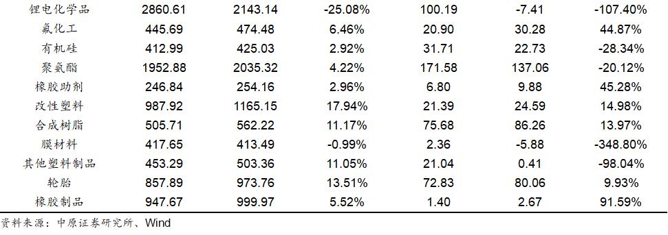 净利润方面,基础化工各子行业净利润表现出现较大分化。33个子行业中有17个子行业净利润实现增长,16个子行业净利润同比下滑。其中氯碱、印染化学品、橡胶制品、复合肥、其他化学原料行业净利润表现较好,分别同比增长160.64%、110.55%、91.59%、65.25%和57.06%,膜材料、碳纤维、锂电化学品、其他塑料制品和农药行业净利润下滑幅度较大,分别同比下滑348.80%、212.45%、107.40%、98.04%和77.61%。净利润增长的行业中,氯碱、橡胶制品、复合肥等行业主要受益于下游需求恢复以及行业供需格局的优化。此外碳纤维、锂电化学品等产业受行业产能快速扩张,行业竞争加剧等因素影响,利润下滑幅度较大。