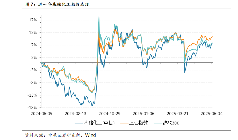 从化工产品价格上看,2022年下半年以来,随着行业新增产能的逐步释放,中国化工产品价格指数总体呈下行态势。2024年6月以来,随着油价的下行以及供给的进一步增长,化工产品价格指数迎来一轮下行态势。截止2025年6月17日,中国化工产品价格指数CCPI为4137点,2025年以来累计下跌3.95%。