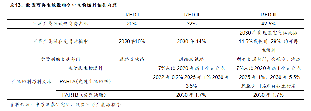 欧盟于2009年开始实施《可再生能源指令》(RED),大力推动了生物燃料在交通领域的应用。2018年欧盟出台了《可再生能源指令》(RED II),并于2021年正式执行。该指令提出了2021-2030年可再生能源发展的目标和规划,欧盟将进一步优化生物燃料结构,鼓励以废弃资源综合利用的油脂原料生产的先进生物燃料。2023年修订的《可再生能源指令》(RED III)将可再生能源在最终能源总消费总量中的份额提升到42.5%,可再生燃料在交通运输领域的占比上升到29%,有望大幅拉动生物柴油需求。从具体细则看,以废弃油脂、动物油为主的生物柴油减排属性较好,是未来发展的重点。未来欧洲对生物柴油的需求增量将主要来自于基于废油脂的生物柴油,其需求量有望大幅提升。