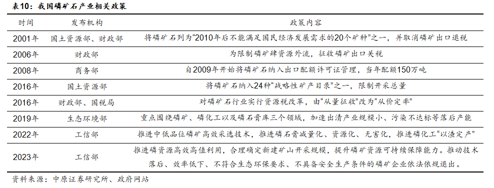 2016年开始,国土资源部将磷矿石纳入24种“战略性矿产目录”之一,磷矿已经成为我国重要的战略性资源。同时财政部对磷矿实行资源税改革,从而提高中低品位磷矿的开采利用,降低磷矿石的资源浪费,推动行业的整合。生态环境部、工信部等部门也出台各种措施,加大磷矿开采的环保整治力度,提高磷矿的资源利用率,推动中小产能的出清。