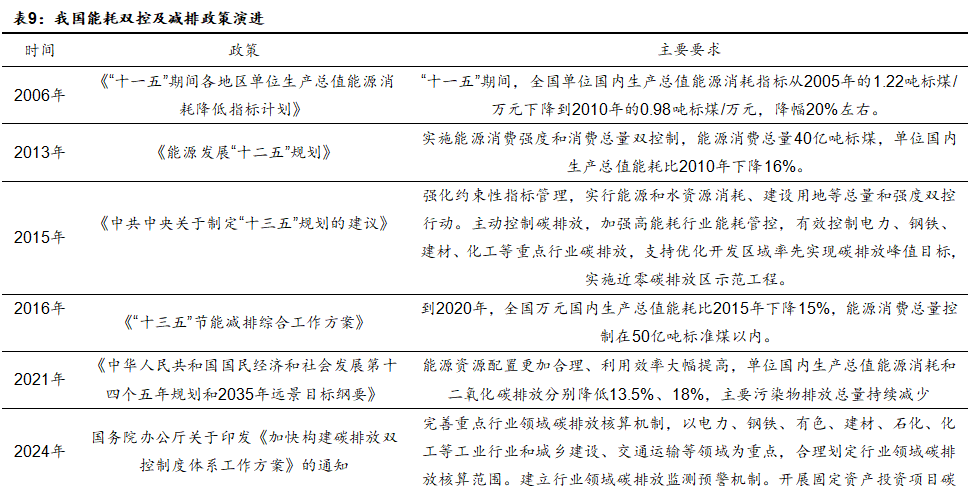 随着行业反内卷整治的进一步深入,化工行业部分领域的产能重复建设、无序过度竞争的现象有望缓解。与此同时,随着环保、安监、减排等方面的监管要求的不断提升,亦有望推动化工行业供给侧的迎来新一轮的约束。为全面实现碳达峰、碳中和的双碳目标,近年来我国减排政策和目标不断推进,并逐步由能耗双控向碳排放双控的新机制全面转型,将能源消费总量和强度控制转向碳排放总量和强度控制,推动经济社会发展全面绿色转型。
