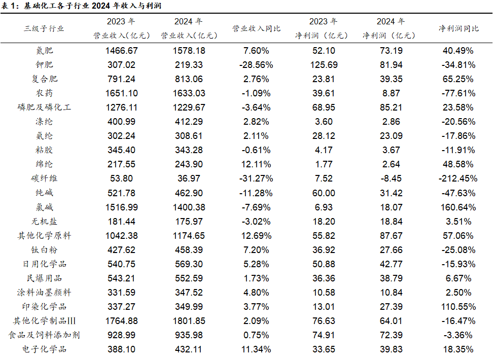 从行业2024年报及2025年一季度来看。2024年,基础化工33个子行业营业收入多数同比增长,其中23个子行业的收入同比实现增长,10个行业收入同比出现下滑。具体来看,改性塑料、轮胎、其他化学原料、锦纶和电子化学品等行业,受益于下游需求的复苏及增长,收入增速相对较快。这些行业2024年营业收入分别增长17.94%、13.51%、12.69%、12.11%和11.34%。碳纤维、钾肥、锂电化学品、纯碱和氯碱行业营收下滑幅度较大,分别同比下滑31.27%、28.56%、25.08%、11.28%和7.69%。